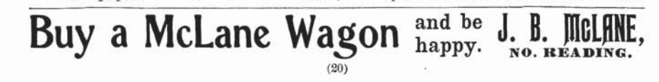 As his blacksmith business grew (see below), he bought an adjoining building and began building wagons. The Town of North Reading purchased one of the first wagons made by McLane for the use of the local police constable (who also served as fire warden, cattle inspector, and sealer of weights and measures).