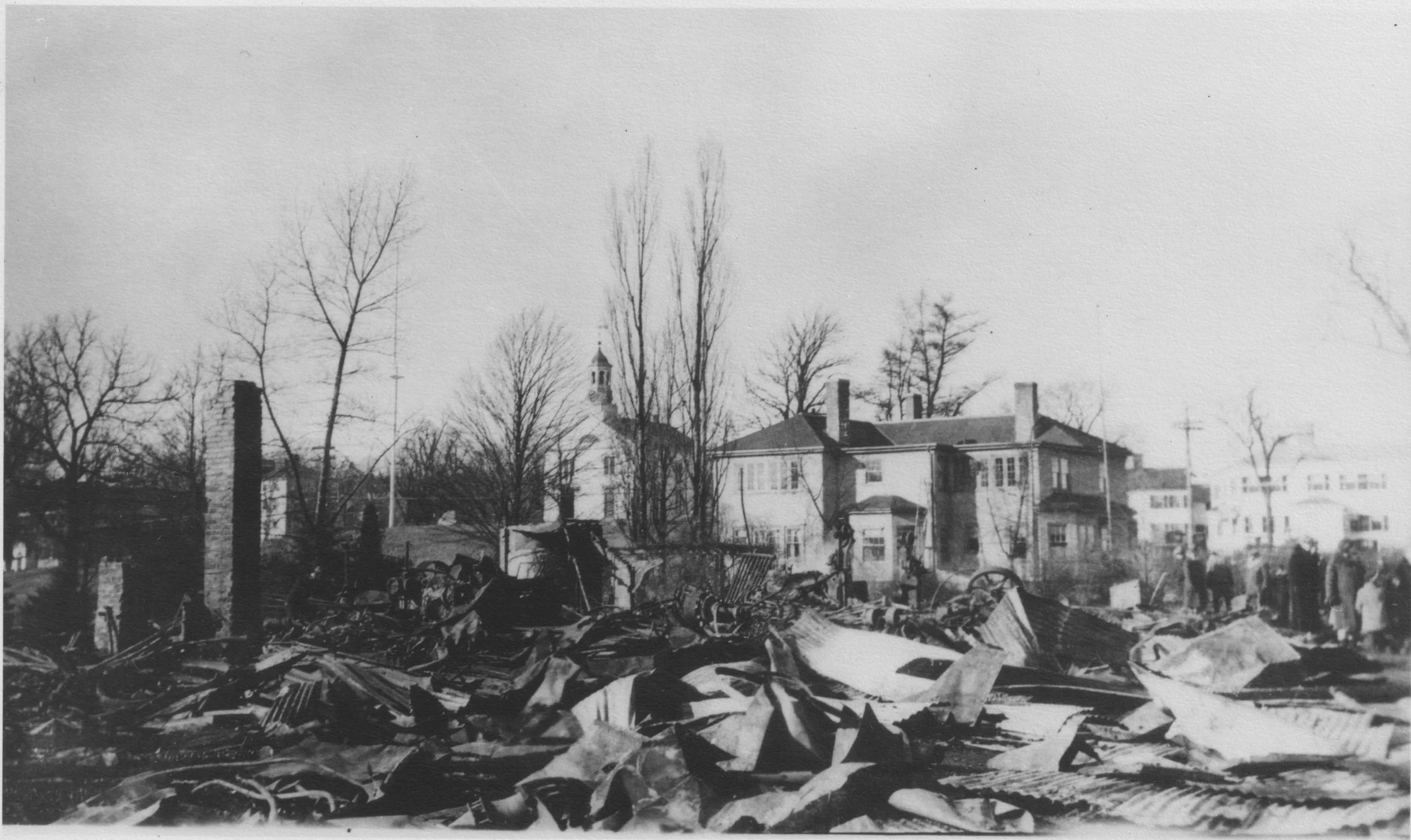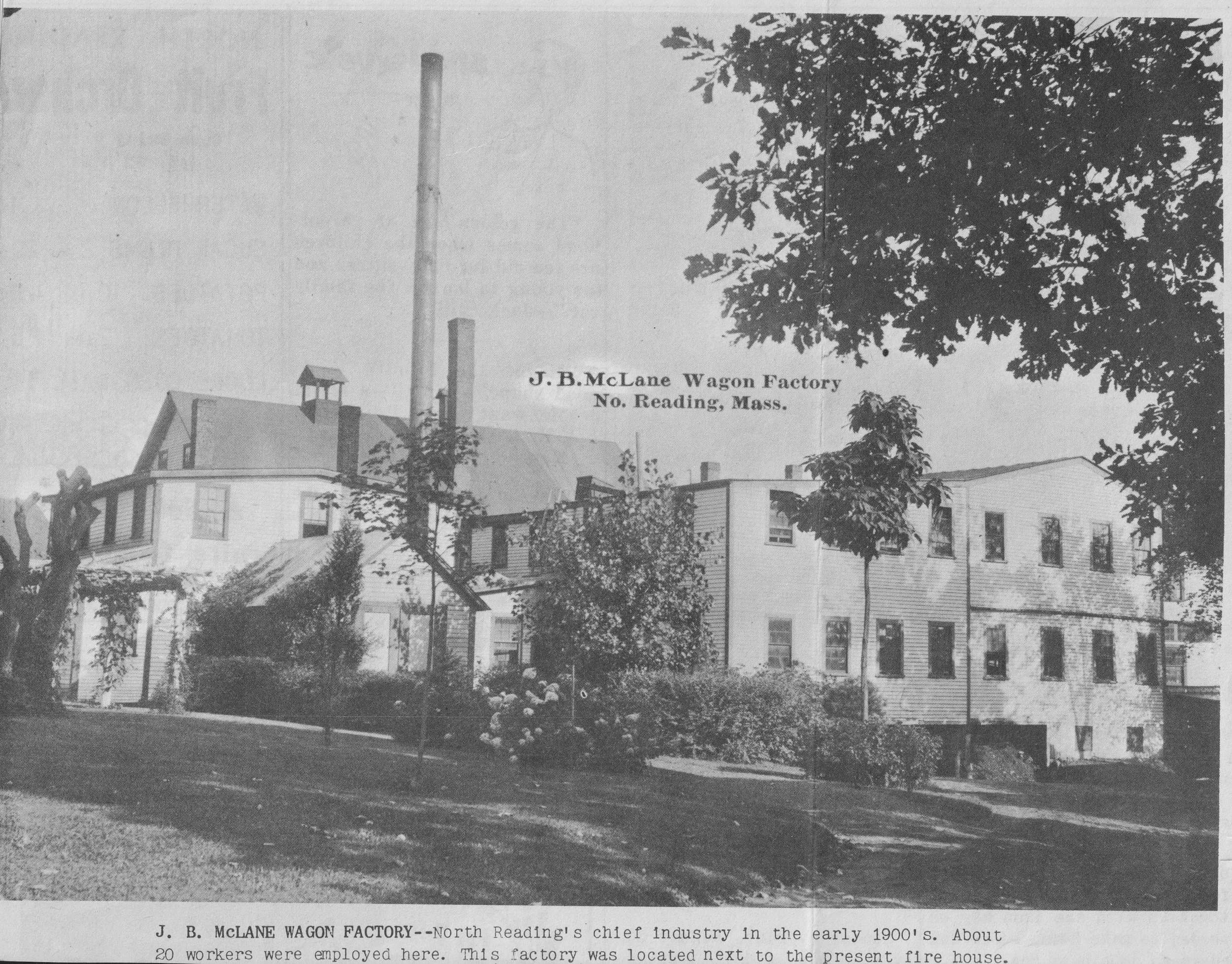 McLane’s son-in-law Foster Batchelder inherited his business, which continued operating (as the North Reading Wagon Factory) until February 1928, when a fire destroyed the entire complex (see below), wrecked several finished wagons, and damaged some nearby businesses. Because of the frigid temperatures, firefighters struggled to pump water from the frozen Ipswich River they needed to put out the fire. The factory folded and was not rebuilt.
